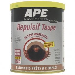 55 bâtonnets. Pour jardins et pelouses. Bâtonnets biodégradables et écologiques. Traitement curatif Non explosif. Emet un gaz lourd s'activant à l'humidité, qui va serpenter et descendre profondément dans les galeries et perturber la fonction alimentaire de l'animal.
