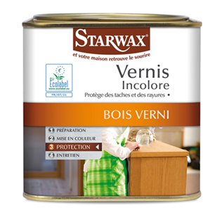 Bonne résistance aux rayures, aux chocs et aux taches courantes (eau, alcool...). Caractéristiques Toutes essences de bois. Lessivable. Sans odeur. Formats possibles: 250ml, 500ml, 1L PRéPARATION Appliquer de manière préventive, ou curative si nécessaire, le Traitement Meubles et parquets STARWAX. Bois vernis : décaper préalablement avec le Décapant Universel STARWAX. Bois cirés : retirer les couches de cire avec le Décapant Cire STARWAX. Bois exotiques : dégraisser préalablement avec le Dégraissant Bois exotiques STARWAX. Poncer et bien dépoussiérer avant l'application du vernis. Le résultat final varie en fonction de l'essence du bois.Il est recommandé de faire un essai préalable sur une surface non visible. Format 1,5 m2 :idéal pour petits meubles, petits objets, maquettes... APPLICATION Conditions d'application idéales : entre 12° et 25° C. Bien agiter avant emploi (au besoin homogénéiser avec une baguette). Appliquer la première couche en évitant toujours les surépaisseurs. A la fin de chaque couche, passer le vernis dans le sens des veines du bois. Laisser sécher 2h. Poncer légèrement au papier de verre fin et dépoussiérer avant d'appliquer la seconde couche de la même manière. Deux couches minimum sont nécessaires. Recommandations Conserver hors de la portée des enfants. Ne pas jeter de résidus à l'égout et veiller à apporter le contenant dans une déchetterie. Utiliser seulement dans des zones bien ventilées. Stocker à l'abri du gel. CRAINT LE GEL.